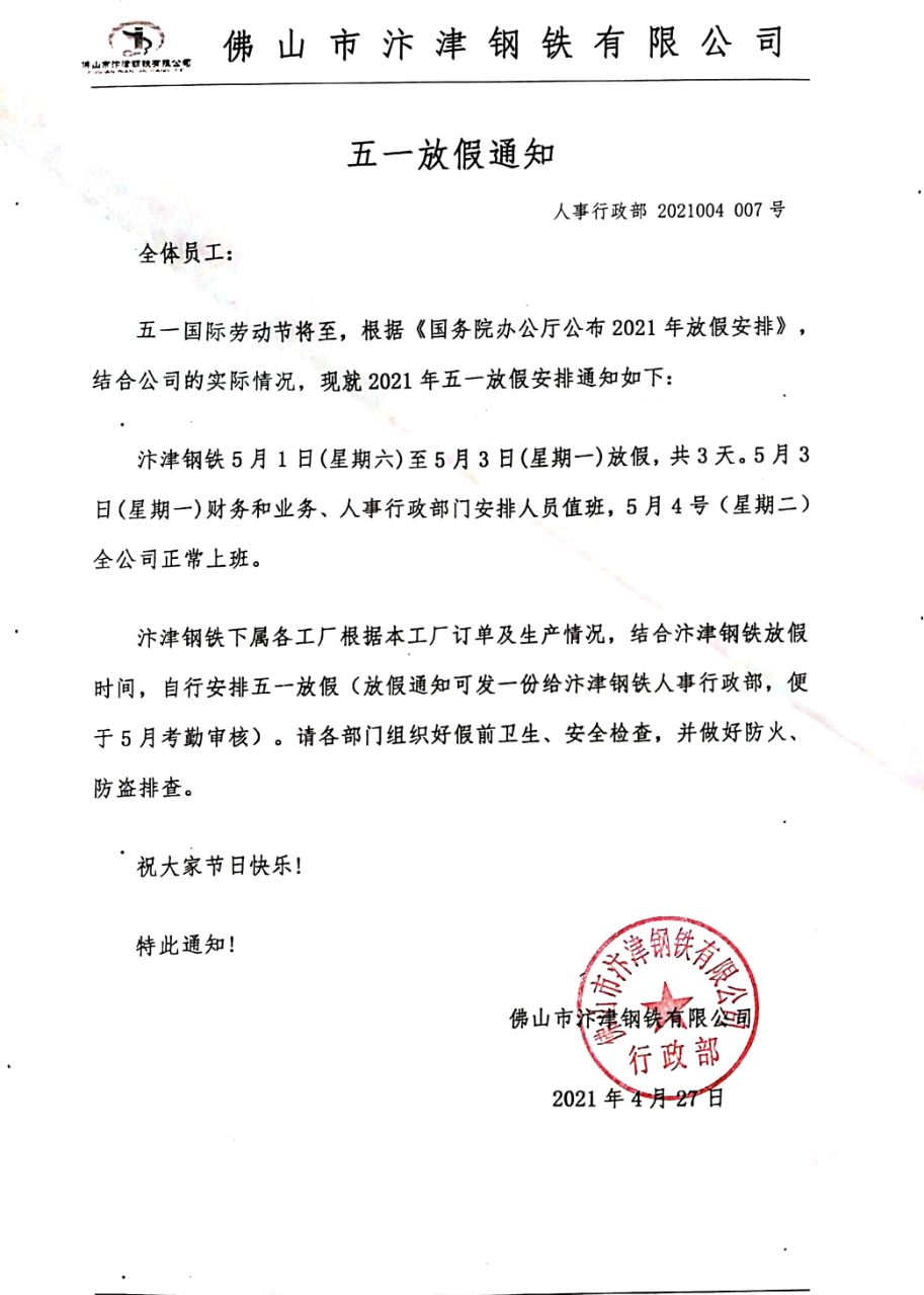 2021年汴津钢铁51放假通知